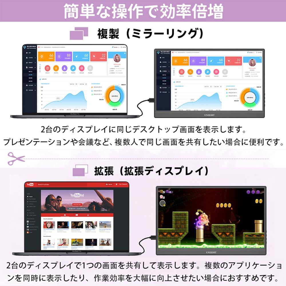 【業務効率の向上】在宅勤務やモバイルワークに最適なモバイルディスプレイです。コンパクトながらもフルHDの解像度で、作業領域を拡大し業務効率を向上させます。使い終わった後も片付けが簡単で、場所を取りません。