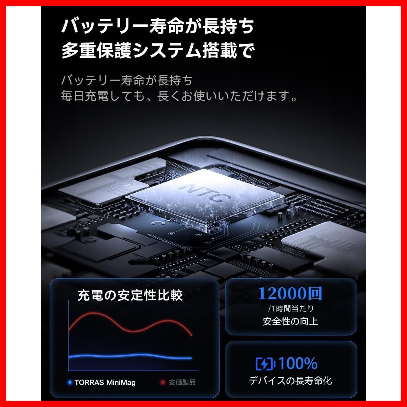 品質最強、長寿命モデル:TORRASは、バッテリーの中核となるセルから徹底的に品質を追求。電気自動車テスラ級の高性能バッテリーを採用し、一般的な安価製品と比べて熱安定性が高く、発火のリスクを大幅に低減。日々の充電がさらに安心かつ快適に。