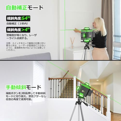 【2025 年最新改良の高精度16ラインレーザー墨出し器 R16】改良点:他の墨出し器とは異なり、本体には電量を表示するLCD ディスプレーが搭載されています。作業中のバッテリー残量が一目でわかり、電池切れの心配がありません。改良点:360回転可能な金属ベースを備え、レーザー線と正確な目盛りを参照しながら、機器を全方位に回転させることができます。作業の自由度が格段に向上します。改良点:2本の 360水平線と2本の360垂直線が組み合わされて、部屋全体をカバーします。赤色よりも視覚的に見やすいグリーンレーザーを採用し、明るくて正確な結果を簡単に得られます。レーザー基準はクラス2、1MW 以下で、家庭やオフィスで安全に使用できます。改良点:レーザーの明るさが無段階調節可能です。