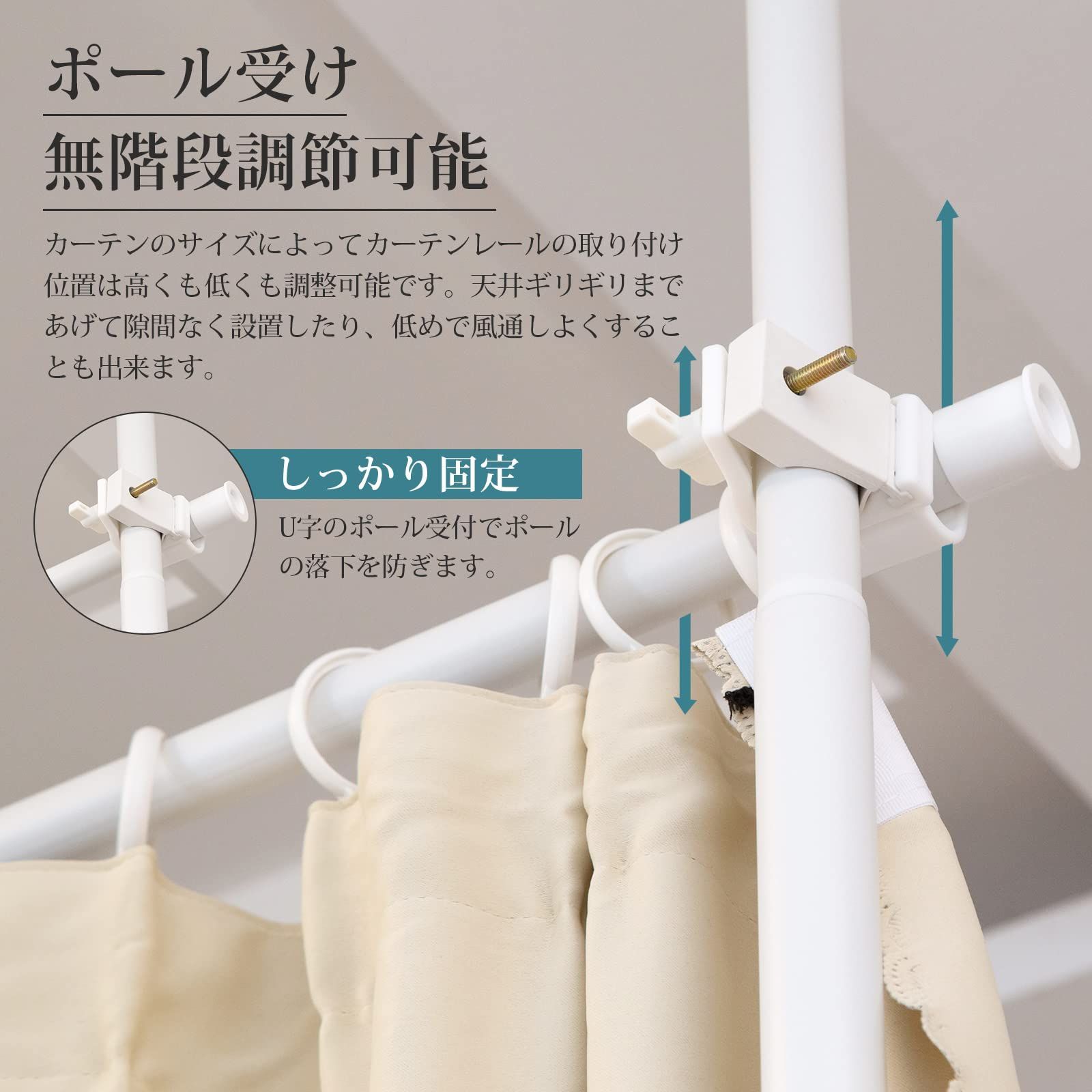 【材質】スチール(エポキシ樹脂塗装) ポリプロピレン ABS樹脂 ポリ塩化ビニル 【寸法】メイン縦棒のみ:110-160cm メイン+延長棒(短):160-210cm メイン+延長棒(長):210-260cm メイン+延長棒(短+長):260-310cm 【付属品】カーテンリング30個 カーテンは付属しておりません。