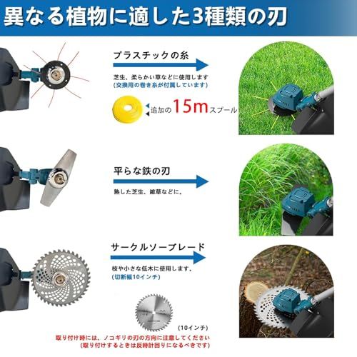 ? 高品質芝刈り機の超高出力ブラシレスモーター & 255mm広刈り幅「▼住宅地家庭用草刈機充電式 25.5cm大型丸ノコ刃採用で灌木や枝も容易に切断。▼25,000回転/分の高出力ブラシレスモーターが従来比30%出力向上&20%省電力を実現。排熱効率が良く全天候作業可能なうえ、騒音を最大20dB低減。灌木対応 草刈り機 の性能を実現。▼住宅地/商業施設でも安心してご利用いただけます。静音草刈機 です。」除草機最長15年使用可能.