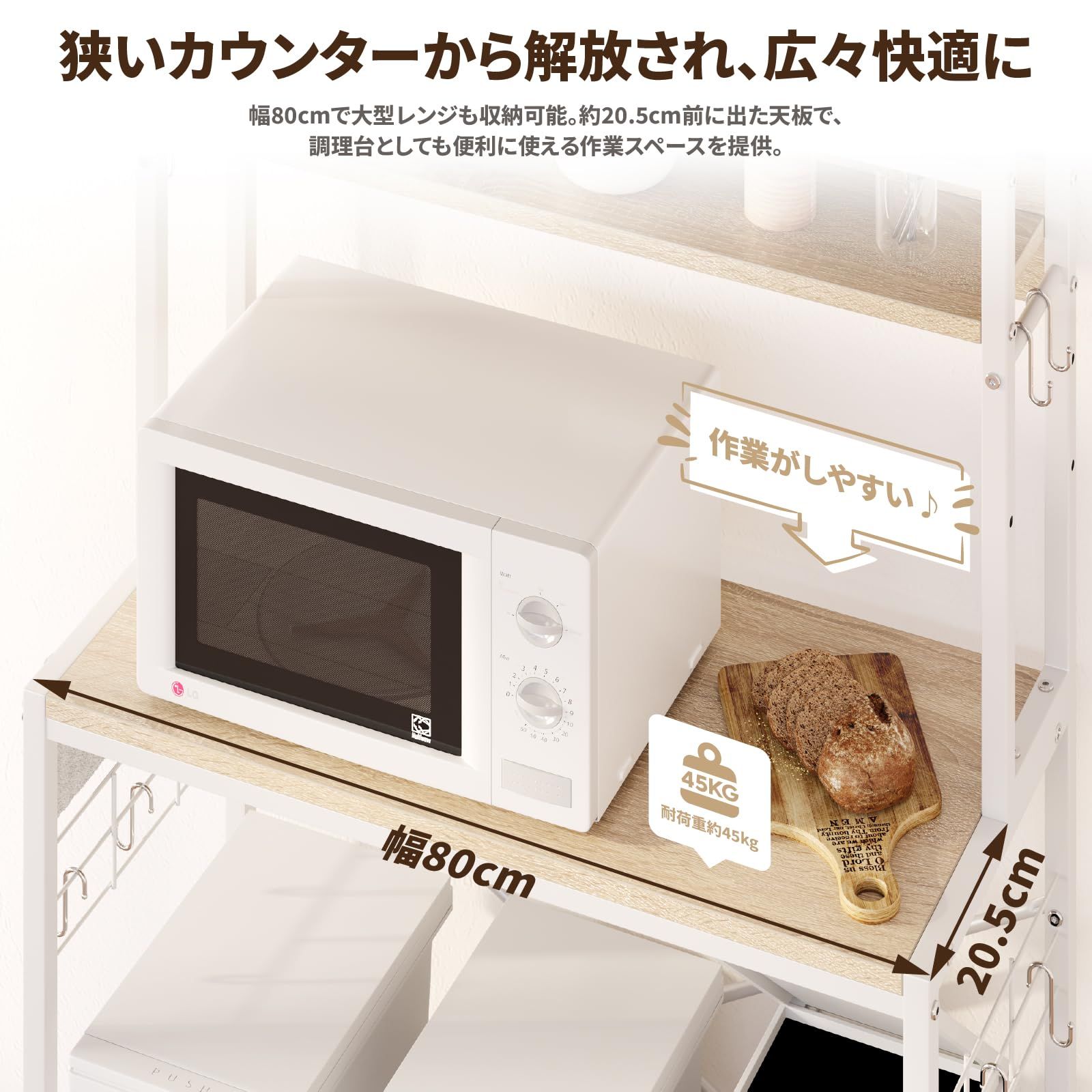 【究極の収納力、ビフォーアフターを実感】ゴミ箱上ラックとして、最大3個のゴミ箱を収納可能。収納スペースの高さ82.5cmで、蓋を開けても余裕があり、使いやすさが向上します。2段階調整可能な中段の棚板で、調味料や小物を手軽に収納でき、毎日の料理がもっと便利に。耐荷重45kgの大天板は、電子レンジやオーブンも安定して収納。扉収納でお気に入りの食器や雑貨をホコリから守り、スッキリと整理。さらに、10個のS字フックでキッチンの小物もしっかり収納。デッドスペースを無駄なく活用し、広々と使いやすいキッチンへと生まれ変わります。