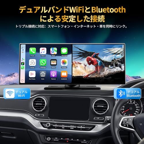 【ワイヤレスCarPlay/Android Autoでスマート接続】 煩わしいケーブル接続が不要なワイヤレスCarPlayとAndroid Autoに対応。Bluetooth 5.2と内蔵クリアマイクで、iPhoneやAndroidスマホをポケットに入れたまま操作可能。初回設定後は車に乗るだけで自動接続され、ナビ、音楽、通話、メッセージなどがすぐに利用可能。運転中のスマートフォン操作が減り、より安全で快適なドライブを実現します。取り付けはダッシュボードに置くだけ、面倒な施工は不要で、初心者でも3分で設置完了!(iOS 10以降のiPhone、Android 11以降のスマートフォンにのみ対応しています。)