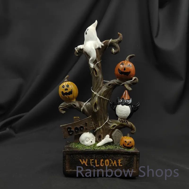樹脂素材で作られたハロウィンのLEDツリーオブジェです。サイズは22.6cm(8.9インチ)の高さと12cm(4.7インチ)の幅で、リアルなゴースト、ジャック.オー.ランタン、フクロウが配置されています。LEDライトが内蔵されており、夜の飾り付けに最適です。スイッチで簡単にON/OFFでき、ハロウィンのデコレーションにぴったりなアイテムです。ポーチや玄関、部屋のアクセントに使用でき、ウェルカムサイン付きで訪問者を暖かく迎えます。