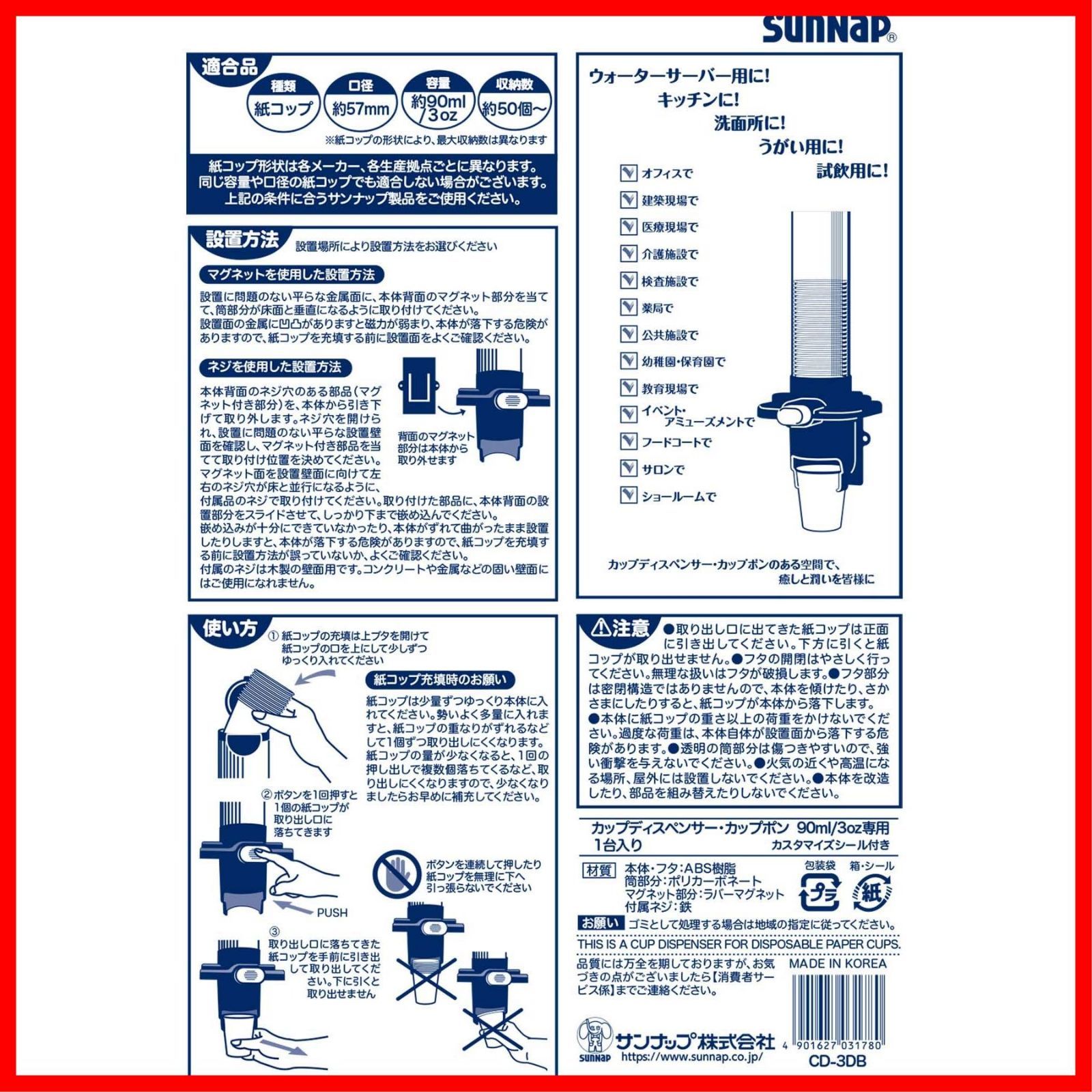サンナップ【紙コップディスペンサー 90ml/3oz サイズ専用】 衛生保管 紙コップ収納ケース 簡単押しボタン式 マグネットorネジ取付け カップポン CD-3DB