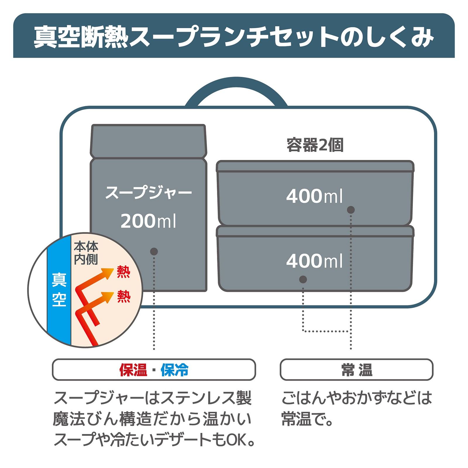おかず容器2個と容量200mlのスープジャー、断熱素材の専用ポーチがセットになったランチセットサイズ(約):幅24.5×奥行8.5×高さ10.5cm、本体重量(約):500g、容量:スープジャー/200ml・おかず容器/400ml×2個保温効力:(ポーチなし)55度以上(6時間),(ポーチあり)58度以上(6時間)/保冷効力:(ポーチなし)12度以下(6時間),(ポーチあり)12度以下(6時間)【スープジャー】本体:ステンレス鋼(アクリル樹脂塗装)