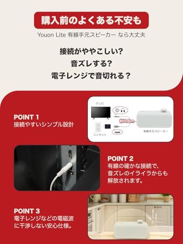 【6W出力約5.8mの「思いやり」ケーブル】「テレビの音声をキッチンでも聞きたい」「コードをごちゃつかせたくない」。そんな欲張りな要望に応える設計です。競合より力強い6W出力で音をロスなく届け、約5.8mのロングコードが、コンセントの制約と見た目の煩わしさを解消。機能と美観の新基準です。