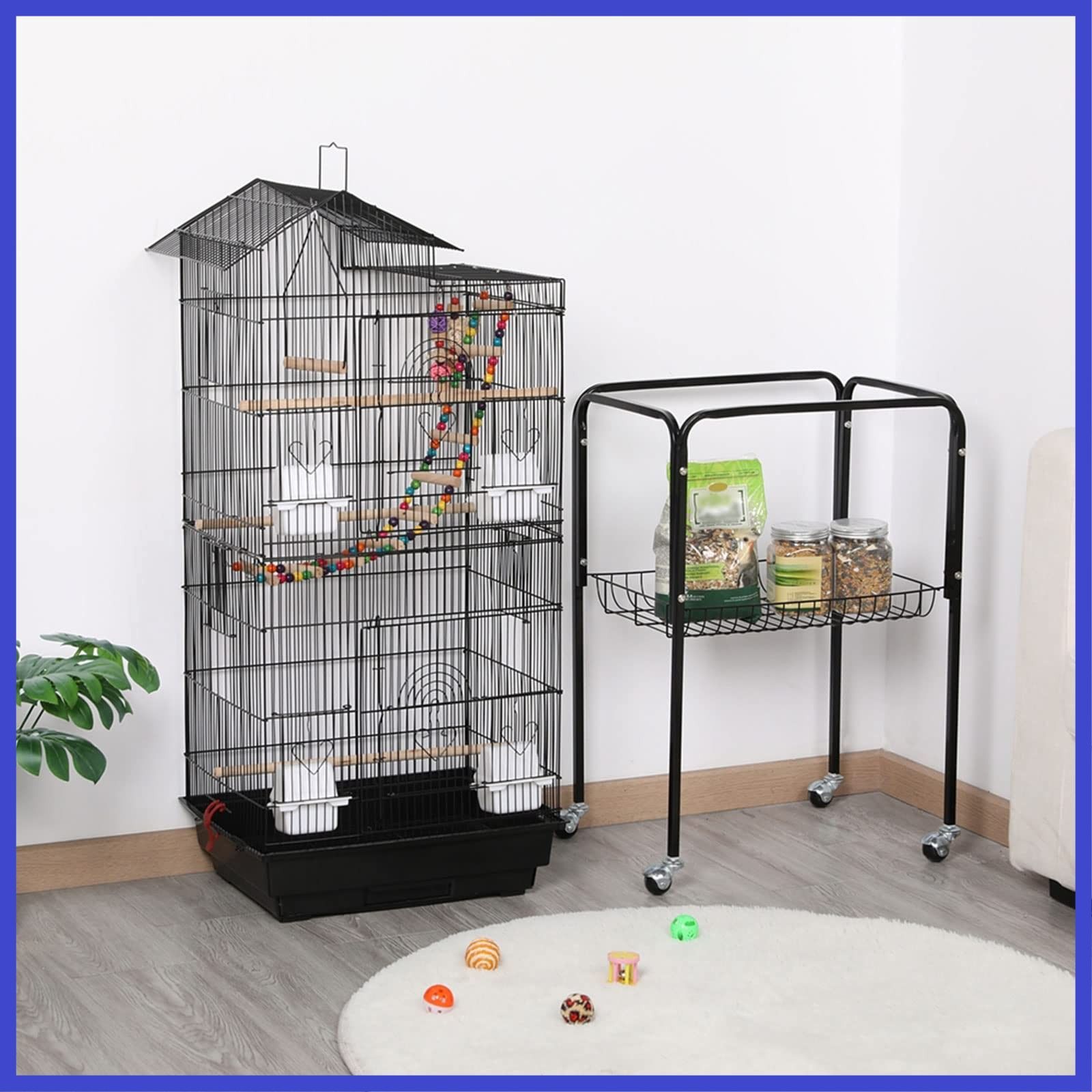 【取り外し可能なデザイン】 本バードケージはキャスター付きで360度回転可能です。上部の鳥かごと下部のスタンドは分離できるデザインで、個別に使用して頂けます。スタンドなしでもキャリア付きのケージは自由に運搬することもできます。ケージには収納棚が追加され、鳥かごの掃除道具、餌、おもちゃなどを収納棚に置くことが可能です。