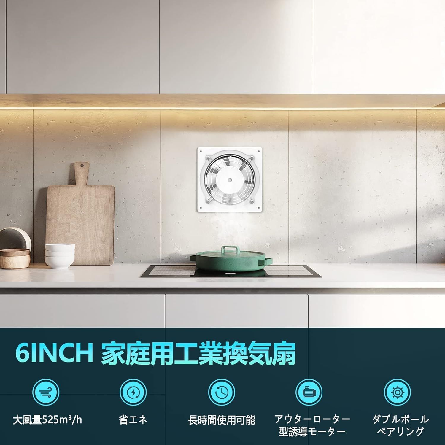 【15cm強化型換気扇】この壁付け業務用換気扇は頑丈な鉄材料を採用され、最新の溶射技術を用いて、耐摩耗・耐高温酸化・耐腐食が優れます。強化型アウターローター誘導モーターとダブルボールベアリング搭載して、送風量は525m3/hに達し、安定、強力な風量を提供します。以前のインナーローター誘導モーター換気扇と比べて、風圧がもっと大きくて、耐久性も優れます。