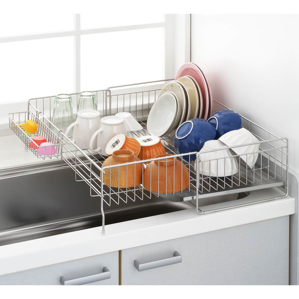 ●シンクサイドのわずかなスペースを利用して使える伸縮式の水切りラックです。