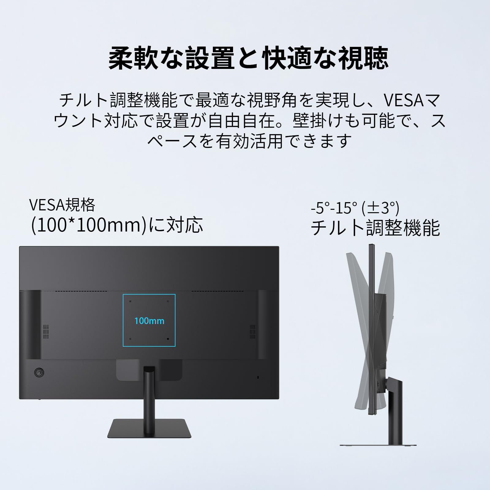 【滑らかで快適なビジュアル体験】100Hz高リフレッシュレート: 標準的な60Hzモニターよりも画面の切り替わりが格段に滑らか。画面の動きがスムーズなので、ビジネス文書のスクロールやWeb閲覧も快適です。Adaptive Sync対応: グラフィックボードの出力とモニターの表示タイミングを同期させ、ゲームや動画再生時の「画面割れ」や「ティアリング」を軽減し、よりなめらかな表示を実現します。
