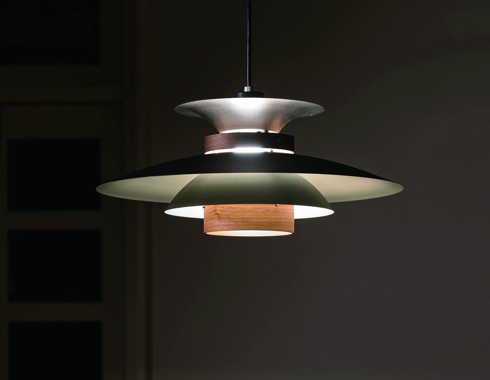 【使用シーン】 ダイニングでは重ねたセードからこぼれるあたたかな光がテーブルの上の料理を美味しく演出し、天井にも広がる光はリビングを和やかに演出します。コードの長さを調節することができるので、テーブルやソファの高さに合わせたスタイリングが可能です。ナチュラル、ブラウン、ウォールナットの3つのカラーバリエーションは様々なインテリアにフィットします。