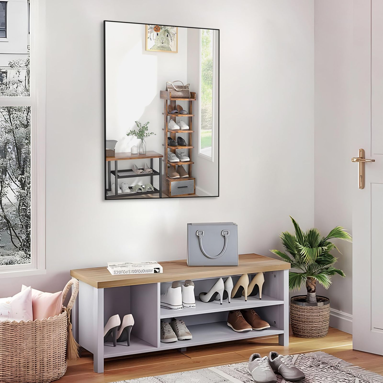 クラシックでモダンなデザイン: マットブラックの長方形ミラーは流行り廃りがありません。ご自宅のどの壁面でも、モダンさを体験できます。適応性の高いスタイルは、どんな装飾にもシームレスに溶け込み、人目を引きます