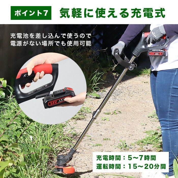 充電式でコードレス!高速回転する刈刃で雑草を気持ちよく刈り込み!充電式のコードレスだから広範囲に使うことができます。樹脂刃、金属刃、チップソーの3種類の刃が付属しているからこれ一台で、柔らかい草や枯れ草、若い小枝まで対応!伸縮式のポールやヘッドの角度調節、補助ハンドルの上下位置などの調節もできます。安全を配慮した、障害物から刈刃を守るフロントガードや、作業者に刈った草が飛散することを防ぐセーフティカバー付き。二重スイッチで誤操作も防げられる家庭用草刈機です。
