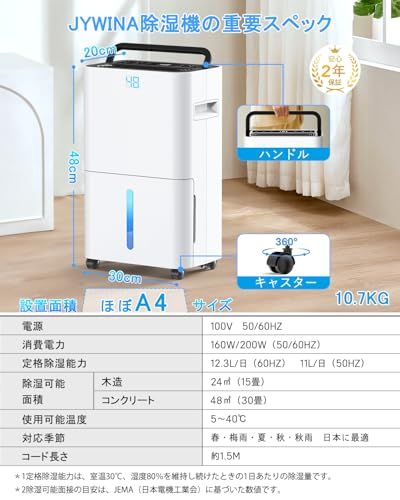 【優れた除湿性能・グングン湿気を吸収!】:JYWINAの最新除湿機は従来モデルより大幅に性能が向上し、1日あたりの除湿能力が12.3L、より迅速に湿気を取り、適応畳数:木造15畳、鉄筋30畳!寝室、クロゼット、脱衣所、洗面所、トイレにはもちろん、広いリビングにも適用できます。高温多湿の日本の梅雨時期や真夏、春秋の湿気取り対策、カビ対策、洗濯物の室内干しに幅広く活躍できます。