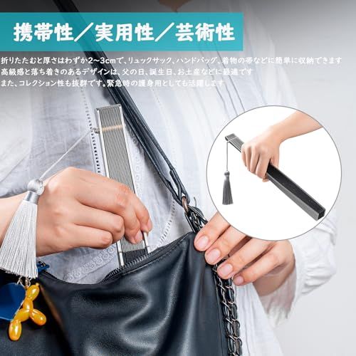 折りたたみ式鉄扇:外側の扇骨はアルミ合金製で、軽量かつ頑丈。厚みと幅を増した設計で扇面を効果的に保護します。中央の親骨はステンレス鋼製で、優れた弾性と耐久性を備えています。