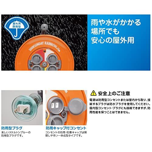 【特徴】雨や水がかかる場所でも安心安全の屋外用防雨型コードリール。コンセントの防雨・防塵キャップは開閉しやすい一体成型。プラグがどのコンセントから電源を取っているか一目でわかる表円盤シールラベル仕様。使用中のコンセントが分かりやすいよう4つのコンセントに色を設定。