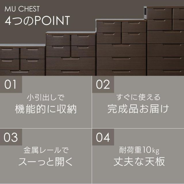 小引き出しには小物、大きい引き出しには衣類など 1つのチェストで様々なものを収納できます。