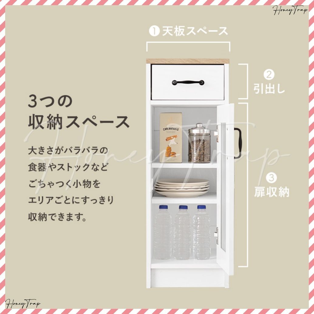 隙間に置けるスリムタイプのキッチンラック。扉付でホコリが入らず見た目もスッキリ。サイズ違いのラックと並べて使用も可能です。