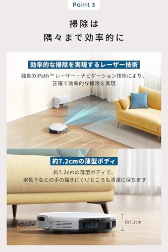 掃除は隅々まで効率的に:約7.2cmの薄型のボディで狭い空間にも入り込み、手の届きにくいところも隈なく清掃します。またiPathレーザーナビゲーション技術により掃除に最適なルートを作成し、効率的に掃除します。