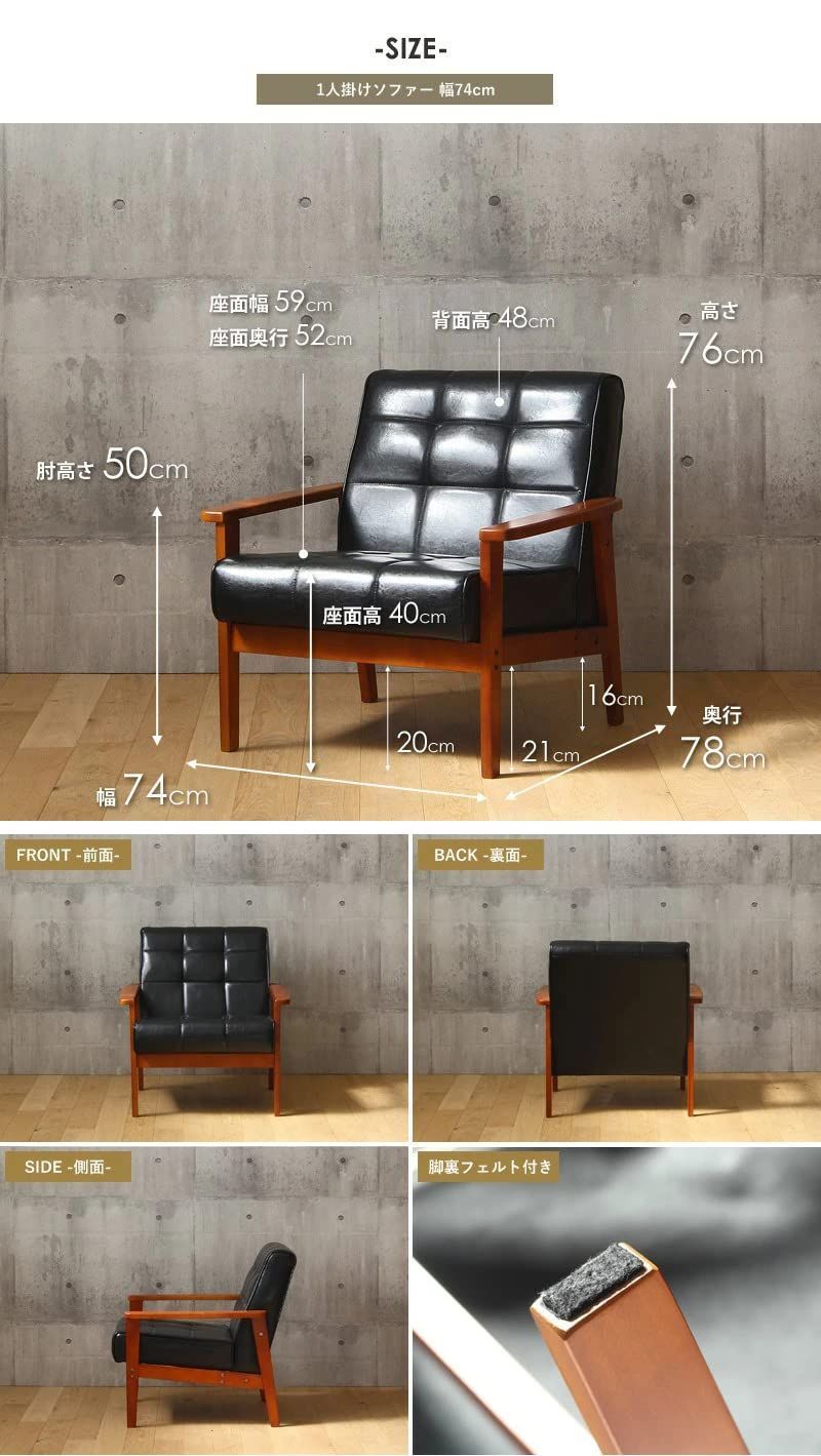 岩附 ソファ 1人掛け レザー 合皮 肘付き 天然木脚 幅74 cm 黒 ブラック レトロモダン ヴィンテージ IW 72 1 P