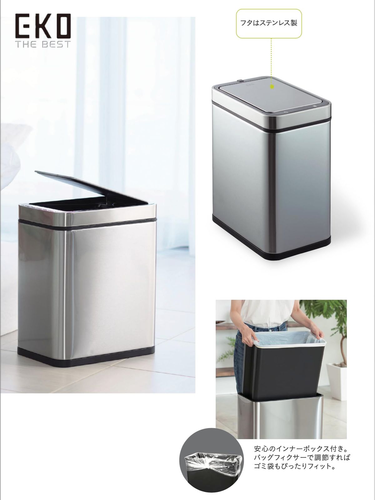 EKOのフラッグシップモデルで、オールステンレスの外観で長くお使いいただけます。フタは静かに開閉する両開きタイプです。