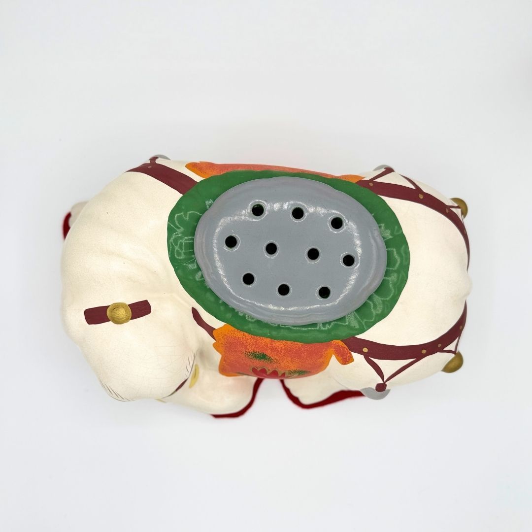 白象をかたどった彩色香炉です。古来、白象は仏教で〈吉兆・知恵・守護〉の象徴とされ、空間に穏やかな福気をもたらします。和室はもちろん洋室やリビングにも映える愛らしい佇まいです。