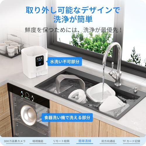 【一瞬を見逃さない】自動給餌器猫 カメラ付きに搭載された300万画素のフルHDカメラは、ペットが家で遊んでいる瞬間を鮮明に記録します。(トリック・オア・トリートの瞬間を記録することも可能) また、カメラを通して、ステンレス製ボウルに残ったペットの食事を見ることもできます。夜間でも、カメラの赤外線センサーがクリアな夜間視界を提供。撮影・録画機能に加え、データはMicro SDカード(最大128GB)やクラウドストレージに保存できます。動体検知機能をオンにすると、猫が動いた際にアプリで通知を受け取るます。