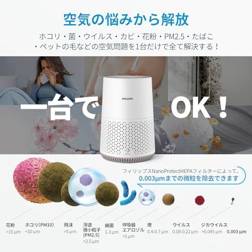 【ナノレベルろ過】ヨーロッパでも大人気な空気清浄機ブランド「フィリップス」。今回、新しいモデル「AC0650」は日本で登場!フィリップス(NanoProtect)HEPAフィルターはHEPA H13フィルターの素材よりも気流抵抗が低く、NanoProtectを搭載したフィリップス空気清浄器では、同等サイズの認定HEPA H13フィルターよりももっと高いクリーンエア供給率(CADR)を提供可能。0.003μm(PM.2.5の800倍の小ささ)の粒子を99.97%除去し、現在までに発見されているいかなる小さなウイルスも逃がしません。