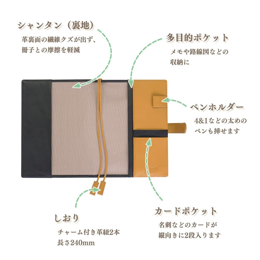 《仕様》本革しおり×2、カードポケット×2、多目的ポケット×1、ペンホルダー×1 《素材》牛本革、シャンタン(裏地) 《サイズ》縦196mm×横146mm×厚み22mm(カバー本体のみ) 《重量》約145g
