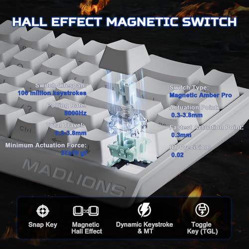 超高速ホール効果磁気キーボード:MAD68 HEは、スピードと精密性を求めるゲーマー向けに設計された最先端のホール効果磁気キーボードです。0.125msの超低レイテンシーと8Kポーリングレートを備えたリニア磁気スイッチにより、キー入力を瞬時に登録。0.02mmの精度と「ラピッドトリガー」テクノロジーで、競技ゲームに最適な比類ない反応速度を実現します