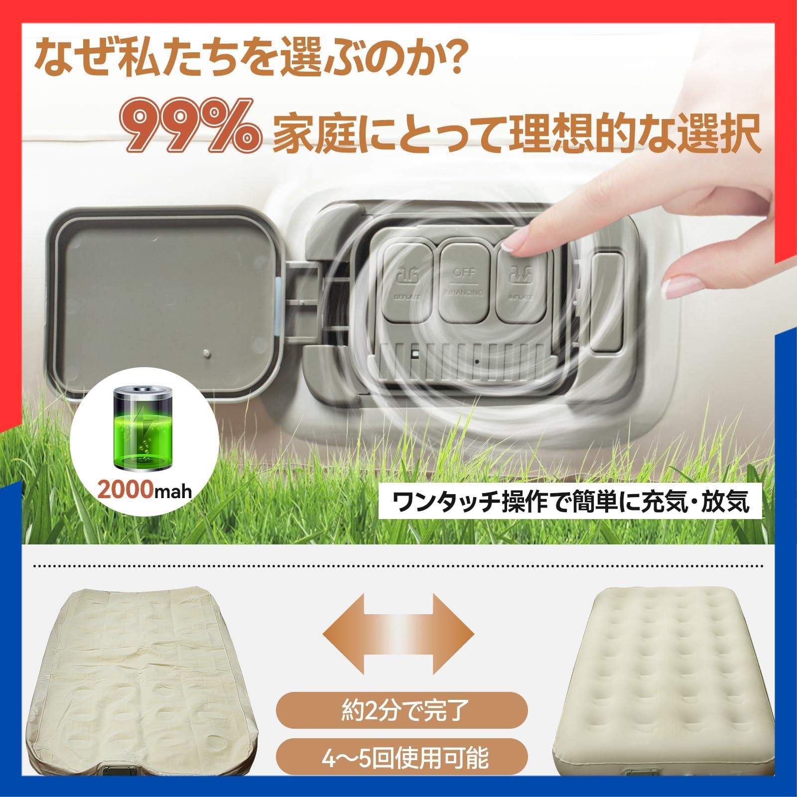 ??【多機能ポンプで安心 & 便利なエアーマット】 このエアーマットは、充電式で取り外し可能な多機能ポンプを装備。暗闇を照らす3モードLEDライトと、寝具やアウトドアグッズに使える3種類のノズル付き。一台で何役もこなし、キャンプや災害時など、あらゆるシーンでおすすめのエアーベッドです。