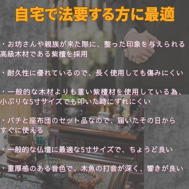「自宅で法要する方に最適な理由 その(3)」 紫檀材を使用している為、一般的な木材よりも重く、小ぶりな5寸サイズでも叩いた時にずれにくい