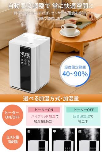 【 最大550ml/hパワフル加湿&6段階ミスト量調節】超音波振動で水を気化してミストを放出する超音波式 X 加湿効率を高めるヒーターを組み合わせたハイブリッド加湿器は、最大加湿量は約550ml/hのパワフルな加湿力を実現し、32畳までの大空間も素早く加湿!さらに、3段階の加湿量調節とヒーター機能の組み合わせで、6段階の加湿量調節が可能です。ヒーターのON/OFFができ、消費電力の少ない超音波式のみへの切替も可能で、電気代を抑え、経済的です。ハイブリッド式だから、 加湿 器のタンク内の水が熱くならず、万が一転倒しても安心です。また、50ppm以下の次亜塩素酸水も対応、空間除菌にも役立つ!