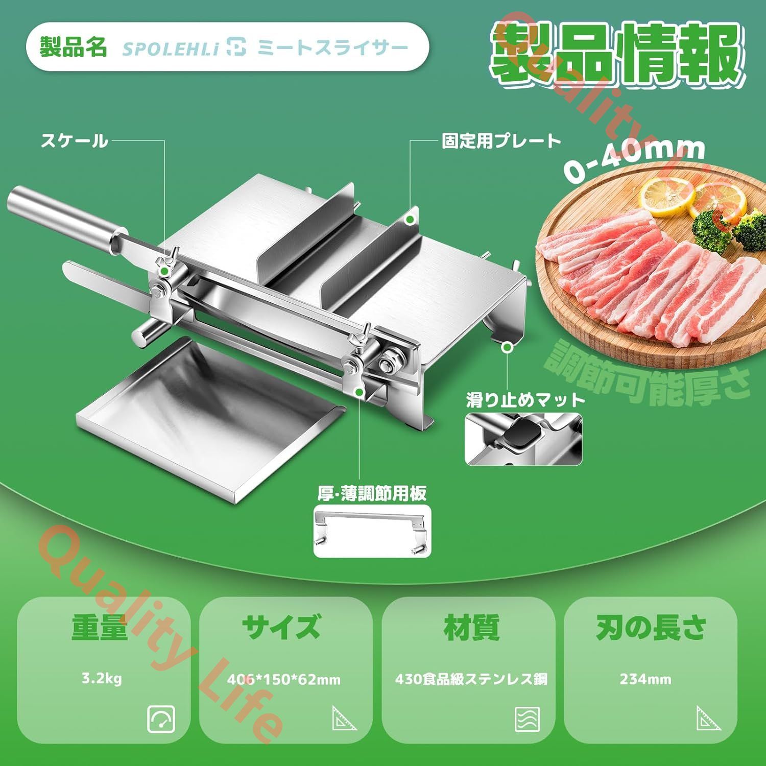 ミートスライサー 手動スライサー 0 40 mm 薄切り 厚切り 固定用プレート 収納トレー付き 234 mmブレード 430食品級ステンレス鋼製 冷凍肉 ベーコン ハム 漢方薬 ジャガイモ お餅 お菓子 家庭用 業務用
