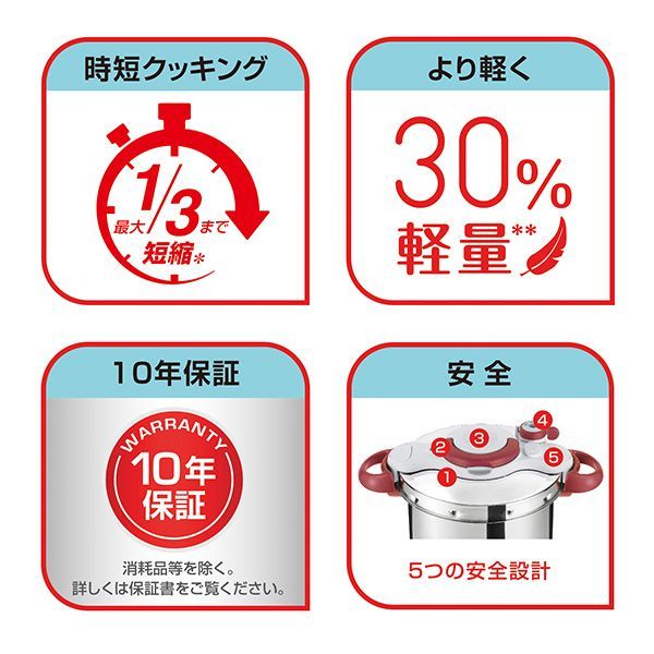 ティファールの圧力なべは、信頼と安心を提供する10年保証。(本体のみ) 安心の安全設計。