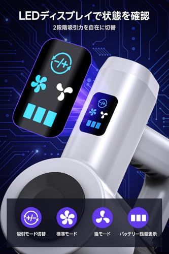 【LCDタッチディスプレイ2段階吸引切替で、操作性を追求】本体には高精細LCDタッチディスプレイを搭載し、バッテリー残量や吸引力モードをひと目で確認可能。標準/強の2段階吸引力切替に対応し、フローリング掃除には省エネな標準モード、カーペットや車内の砂汚れには強モードと、用途に応じた使い分けができます。多くのコードレス掃除機に見られる物理スイッチ式とは異なり、直感的なタッチ操作で誰でも簡単にコントロール可能。日常使いはもちろん、初めてスティッククリーナーを使う方でも迷わず快適に操作できます。