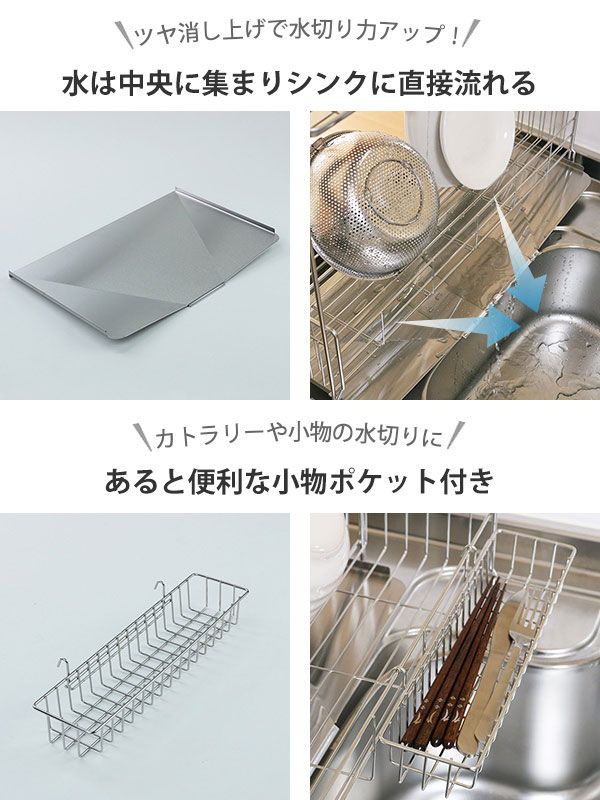水切りラック シンクサイド 幅の広がる水切り 幅26 cm 奥行57 ステンレス カトラリーポケット付き シンク上 スリム 伸縮 水切りかご 水切り 大容量 水切りカゴ ステンレス水切り 水切りバスケット 水が流れる