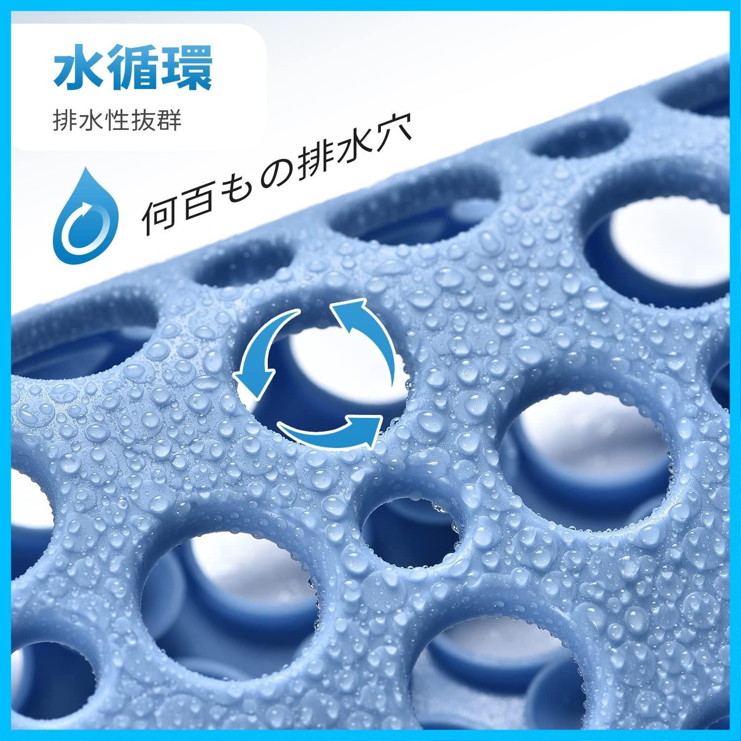 【排水性抜群】お風呂マット表面何百もの排水穴に水分が残らないよう排水穴から素早く排水し、乾いて清潔に保ちます。水が循環できる様に穴が開いてるのが特徴です。使用前に1度洗濯するのがおすすめです。