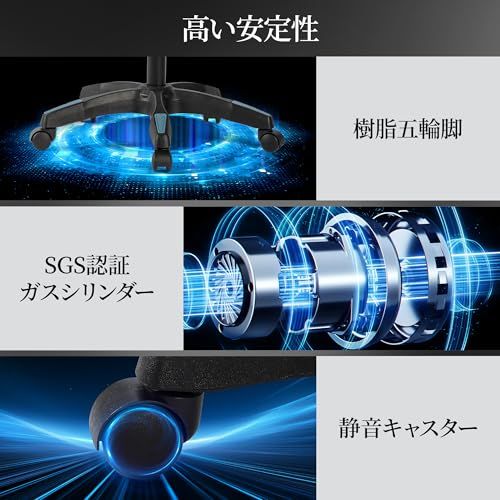 【充実の装備】ゲーミングチェア配備の可伸縮フットレストは、脚を伸ばしてリラックスでき、連動アームレストはリクライニングに合わせて自然に角度が変化。静音キャスターでスムーズに移動でき、SGS認証のガスシリンダーが安全性と安定性を確保します。