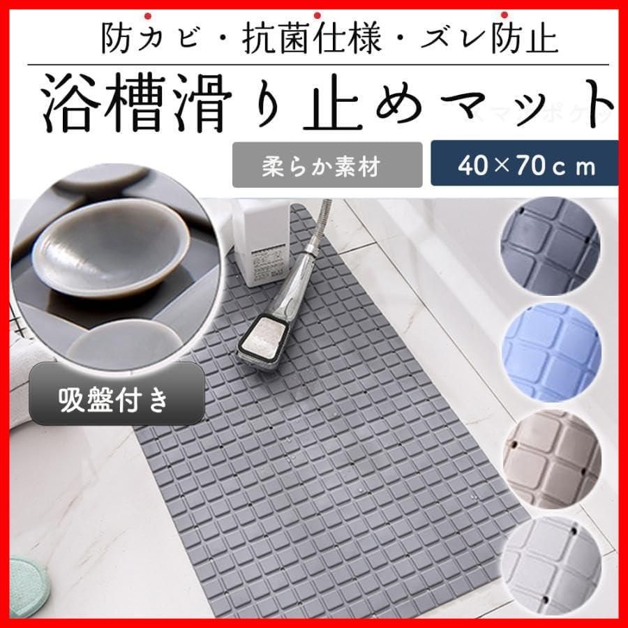 ■表面はデコボコ加工で転倒防止 ■裏面は吸盤でしっかり固定し滑らない ■小さな穴から排水されていつでも清潔 ■吸盤で壁に貼り付けて干すこともできます ■軽量で柔らかいPVC素材で足裏も痛くありません ■丸めて簡単収納 ■浴室・浴槽どちらでも使用可能です ■カラーバリエーションは4カラー サイズ- 40×70cm -素材- 抗菌PVC