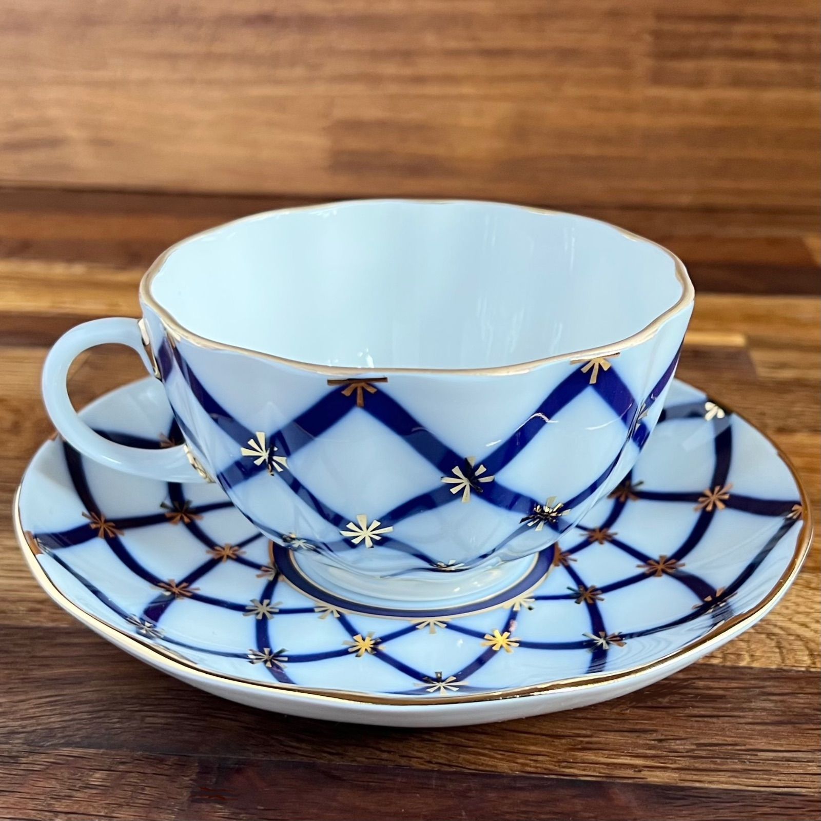 鮮やかな深いブルーで幾何学模様の格子柄、その合い間に、金彩できらきら瞬き模様マークが押されています。真っ白な雪原に煌めく雪の結晶を表した、大変上品なカップソーサーです。