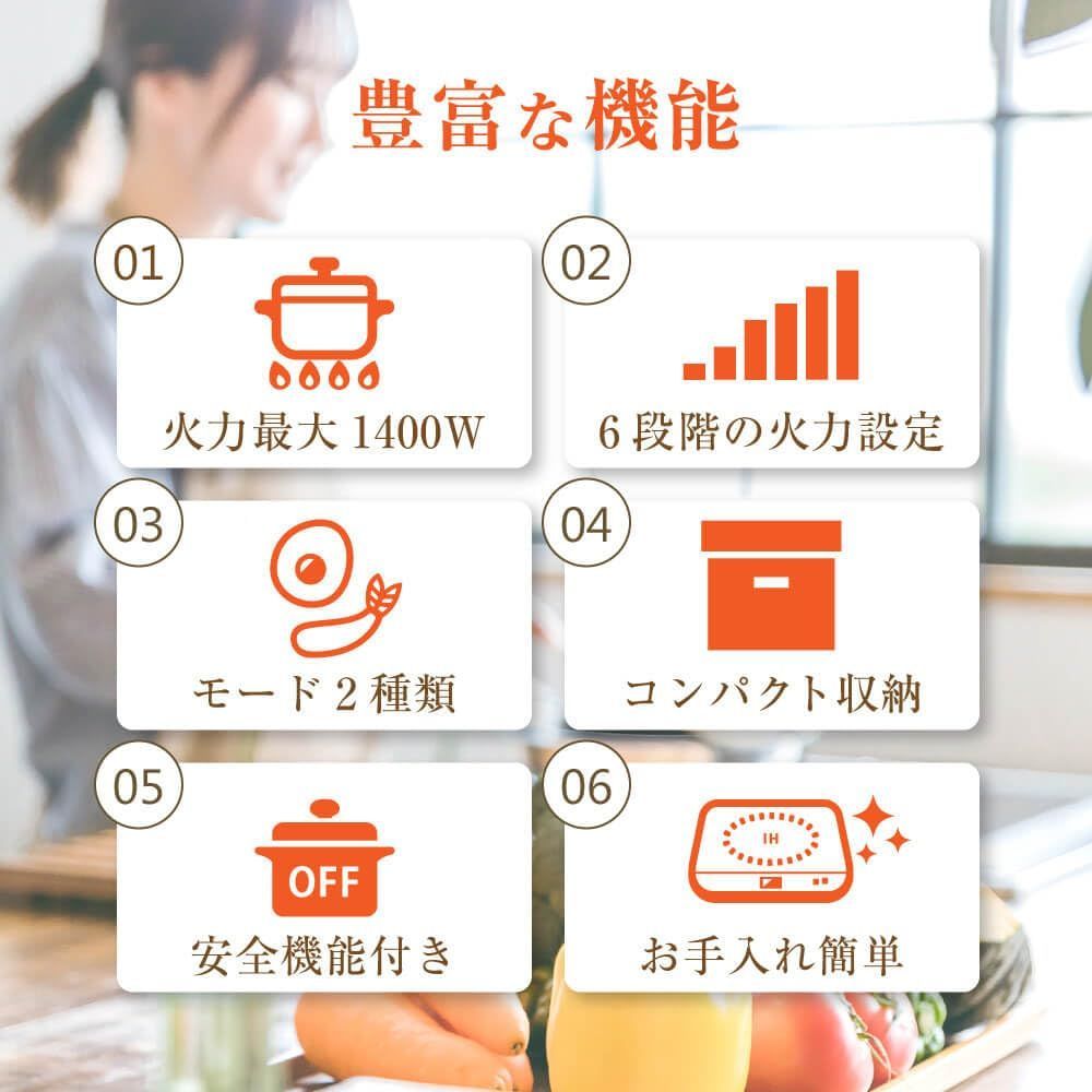★ 豊富な機能 1、火力最大1400W 2、6段階の火力設定 3、モード2種類 4、コンパクト収納 5、安全機能付き 6、お手入れ簡単