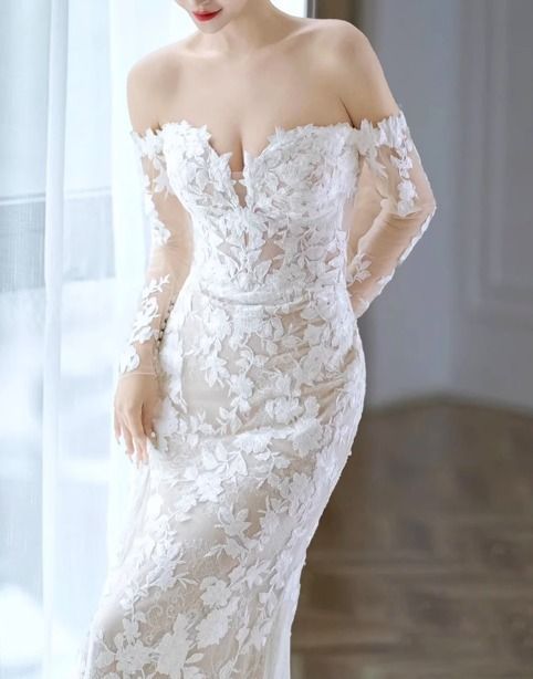 フラワーレース ウェディングドレス 長袖 マーメイド 上品