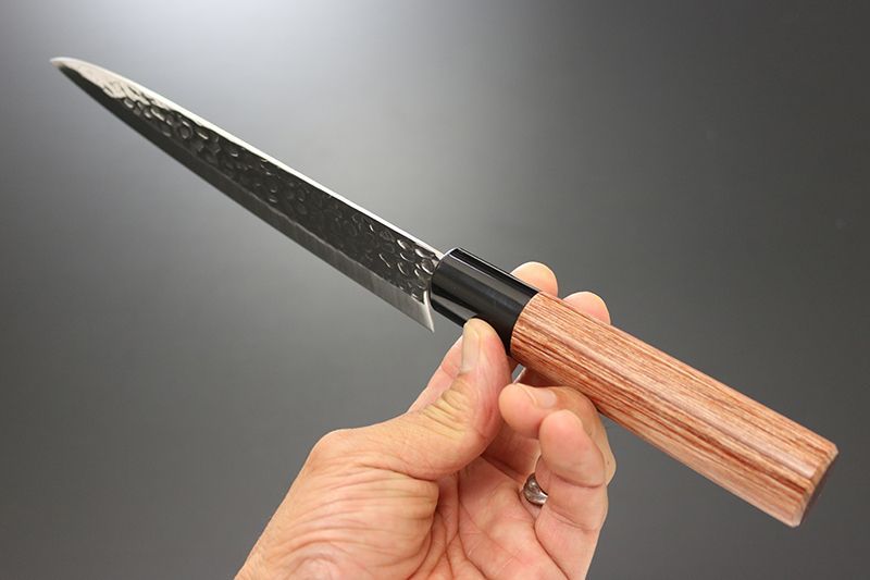 和包丁風のハンドルスタイル。ハンドル材は美しい木目調の赤合板材を使用。鋭い切れ味とメンテナンスの良さを兼ね備えた包丁。鎚目磨きは風合いが美しいだけでなく、食材がブレード面にくっつきにくいこともあり、切れ味を助長し切離れよく快適にカットできます。
