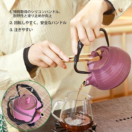 鉄器 南部鉄器 焼き付け鉄瓶 650 ml茶こし付きで茶葉やコーヒーを煮るために使用 伝統的な金縁の模様 内部はエナメル加工 耐熱シリコンハンドル茶道道具 紫色e aedafcdc