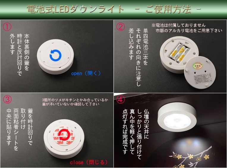 暗いお部屋や夜間に便利な電池式LEDダウンライトが付属