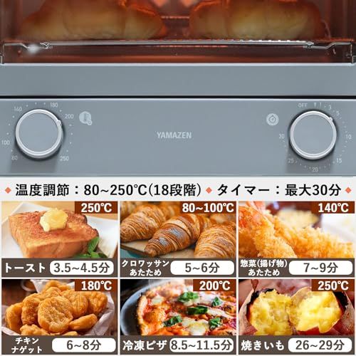 【食材に合わせた温度と調理時間】最大30分まで設定できるタイマー機能、さらに80250度まで設定できる温度調節機能搭載。食パンはもちろん、とろーりチーズのピザにこんがりお餅など食材に合わせてお好みで設定してください。