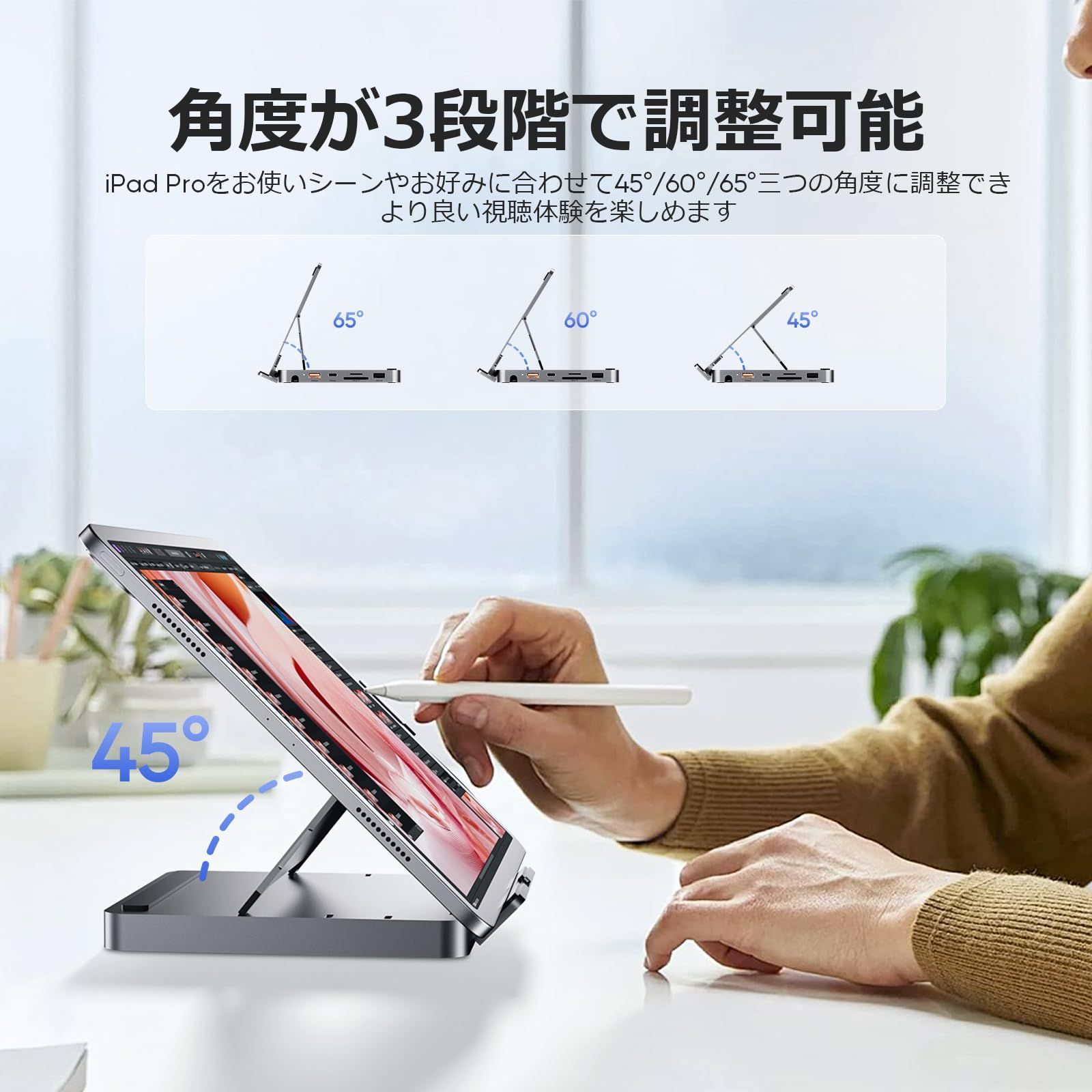 【折り畳み式&幅広い互換性】iPad Pro ハブはアルミニウム製のスタンドとハブを組み合わせたデザインを採用し、折りたたみ式で使わない時、簡単に折り畳んで持ち運び・収納に便利です。スタンド機能として、iPad Proをお使いシーンやお好みに合わせて45°/60°/65°三つの角度に調整でき、より良い視聴体験を楽しめます。ビジネス、旅行、学校、オフィス、自宅など様々な場所に適しています。iPad Mini 6世代、2024 iPad Pro M4、2022 iPad Pro M2、2021 iPad Pro M1、2020/2018 iPad Pro、iPad Pro 12.9 インチ(第3、4世代)、iPad Air (第4世代)、Surface Go/Laptop3/Laptop4/Pro7、Samsung Galaxy S21/S20/S10など他のUSB-Cポート搭載のMac OS、Windows、Androidデバイスに対応いただけます。