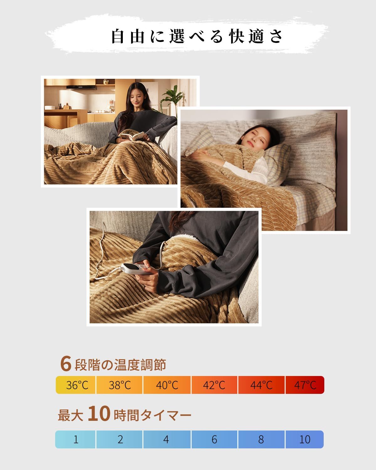 「うるおいタッチでしっとり暖かい、心地いい肌ざわりの電気毛布」? こだわりの「フランネル素材」:ふんわりフランネル素材の電気掛け敷き毛布です。表面がふんわりとした長めの毛足で、しなやかでしっとりした肌触りが特徴。ふわふわの軽さと弾力性に優れ、電気がなくても触れるだけで温もりを感じられます。 従来の素材に比べてしっかりと厚みがあり、包み込むように暖かい。1?6段階と細かく温度調整でき、最?10時間連続使?すると自然にOFFになる安?機能付きにしたことで、低温設定にして朝まで安心して就寝いただけます。ほかの暖房器具は重くて移動できない場合でも、電気?布なら簡単に持ち運べて、お家の中でどこでも暖をとることが可能に。ソファ、ベッド、デスクなど、様々なシーンで使える、掛け敷き兼用の電気毛布です。